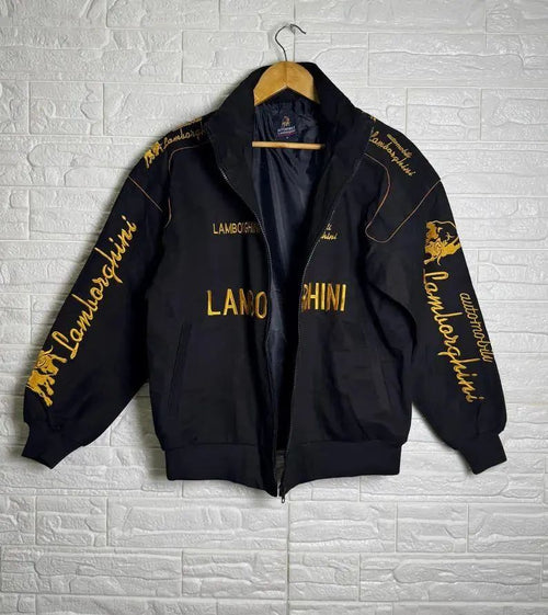 Automobili Lamborghini Embroidered Jacket – Black & Gold Racing Bomber with Bull Logo, Streetwear Motorsport Varsity Style